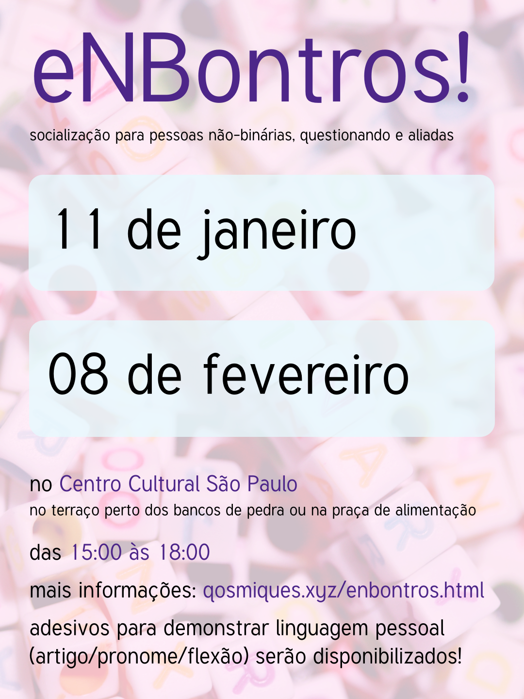 Os eNBontros são encontros regulares de pessoas não-binárias, questionando e aliadas que ocorrem desde 2022 no centro da capital paulista, organizados por Qósmiques.